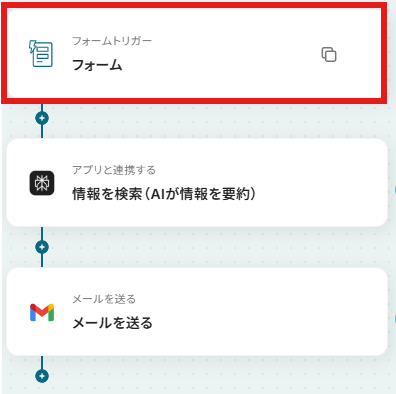 まずはこのフローボットでトリガーになっている、フォームトリガーを設定していきましょう。 フローボットの「フォーム」をクリックしてください。 参考:フォームトリガーの設定方法