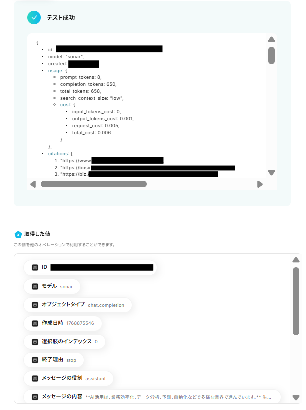 ここまで設定が終わったらテストボタンをクリックします。テストが成功し、取得した値に検索結果が入ればOKです。