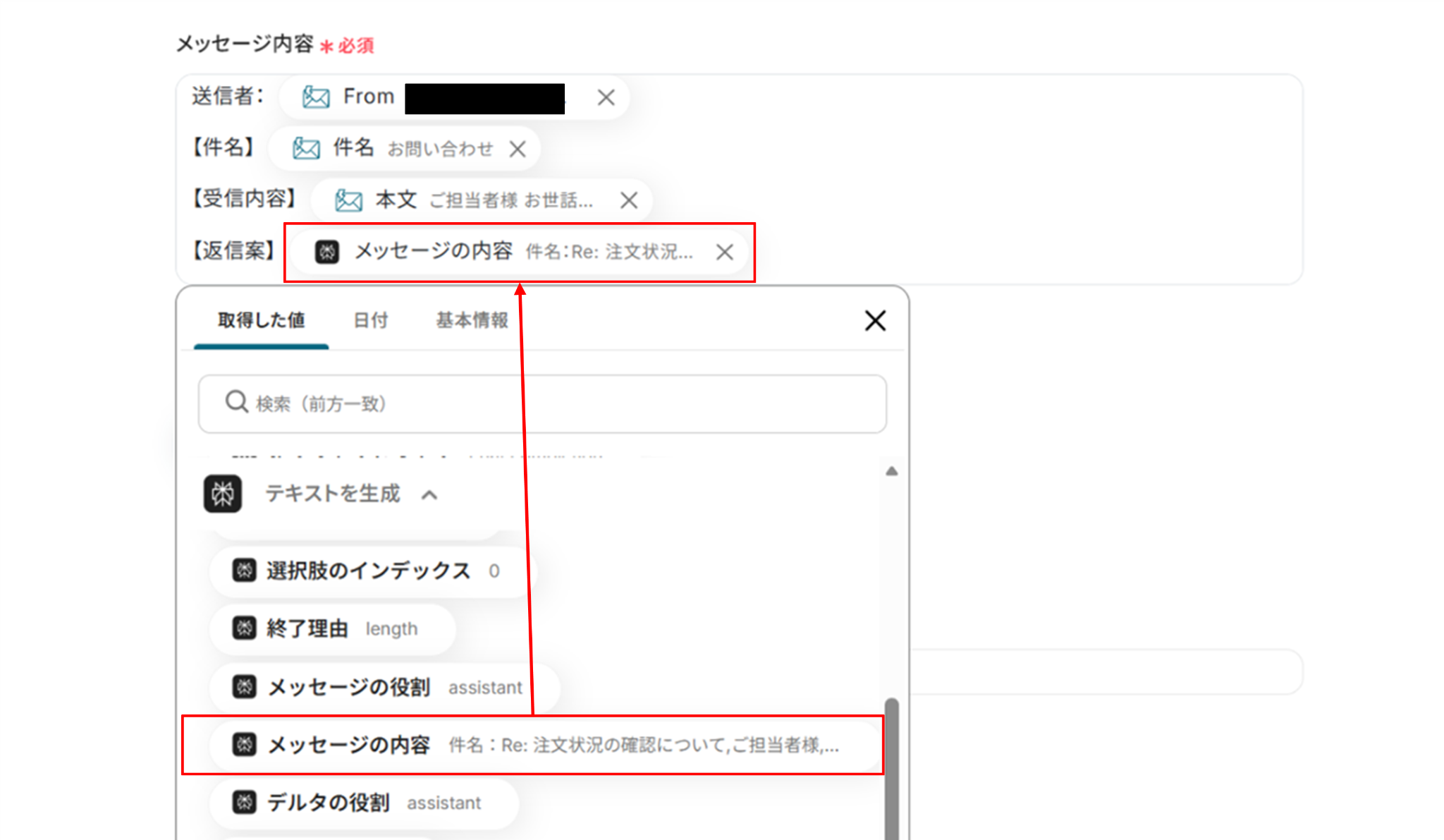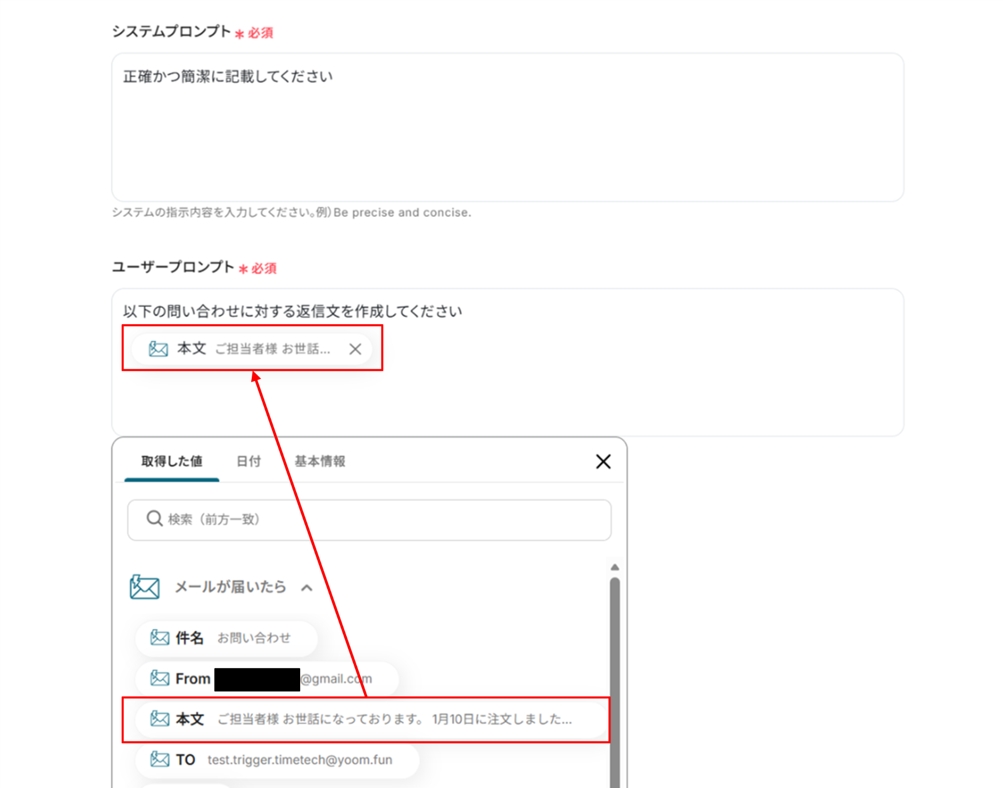 - 次に、オペレーションでPerplexityの「テキストを生成」アクションを設定し、受信したメールの内容をもとに返信案を生成するようにプロンプトを設定します。