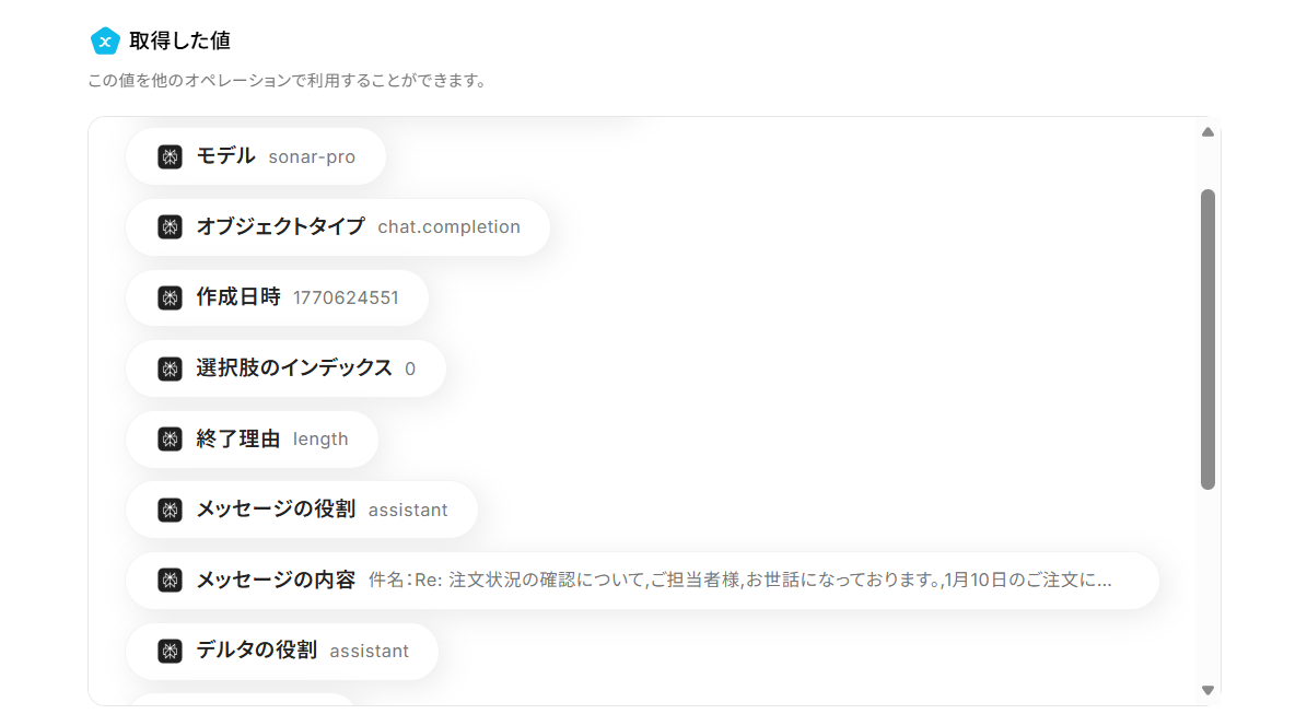 - 通知するメッセージの本文は自由に編集でき、固定のテキストに加え、前段のトリガーやオペレーションで取得したメールの件名やPerplexityの生成結果などを変数として埋め込めます。