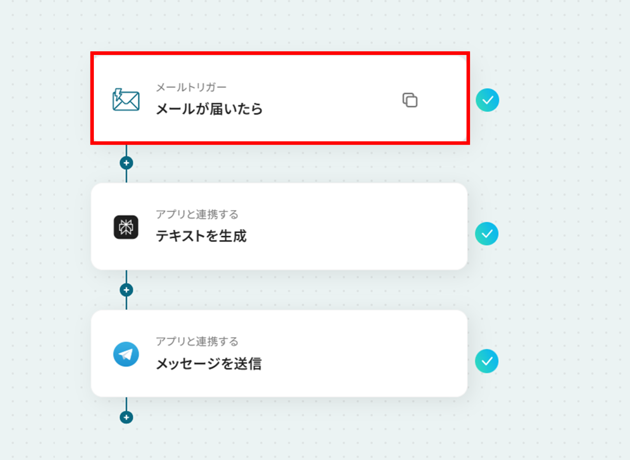 - 次に、トリガーで「メールトリガー」を選択し、「メールが届いたら」というアクションを設定します。
