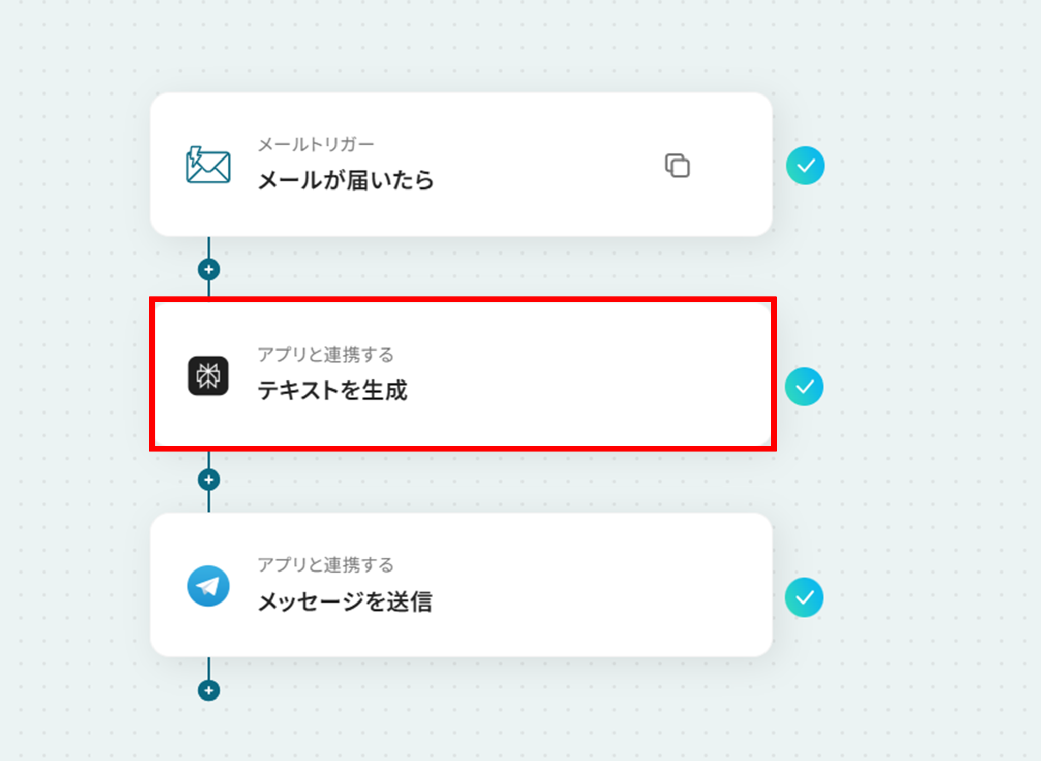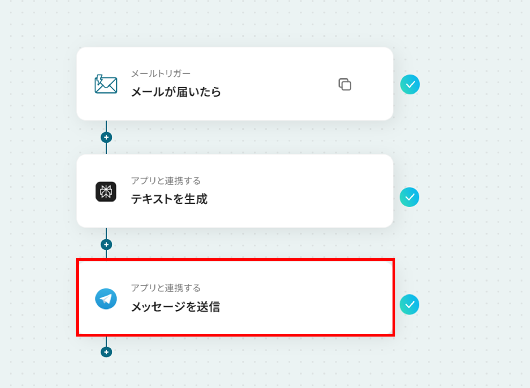 - 最後に、オペレーションでTelegramの「メッセージを送信」アクションを設定し、Perplexityが生成したテキストを指定のチャットに送信します。