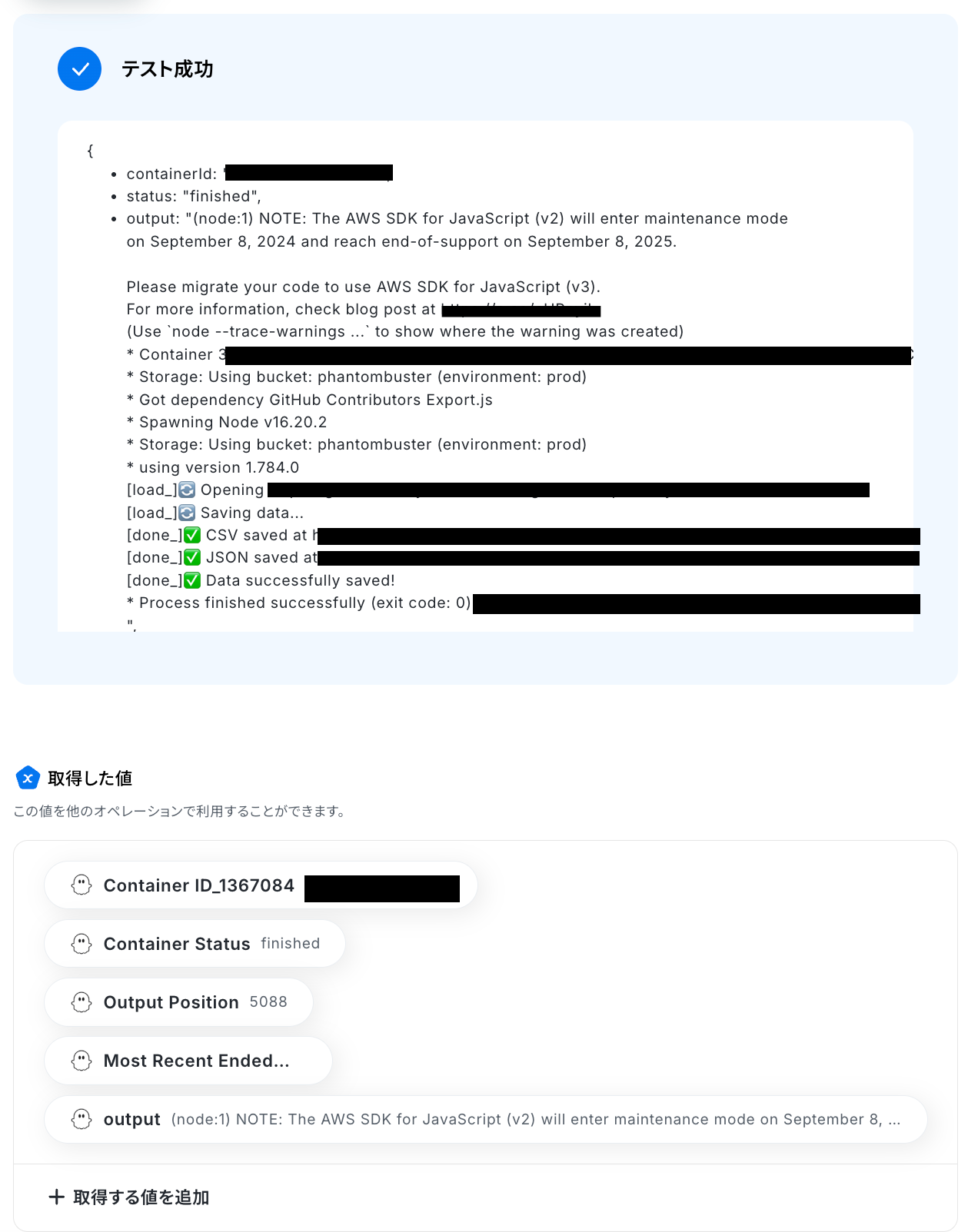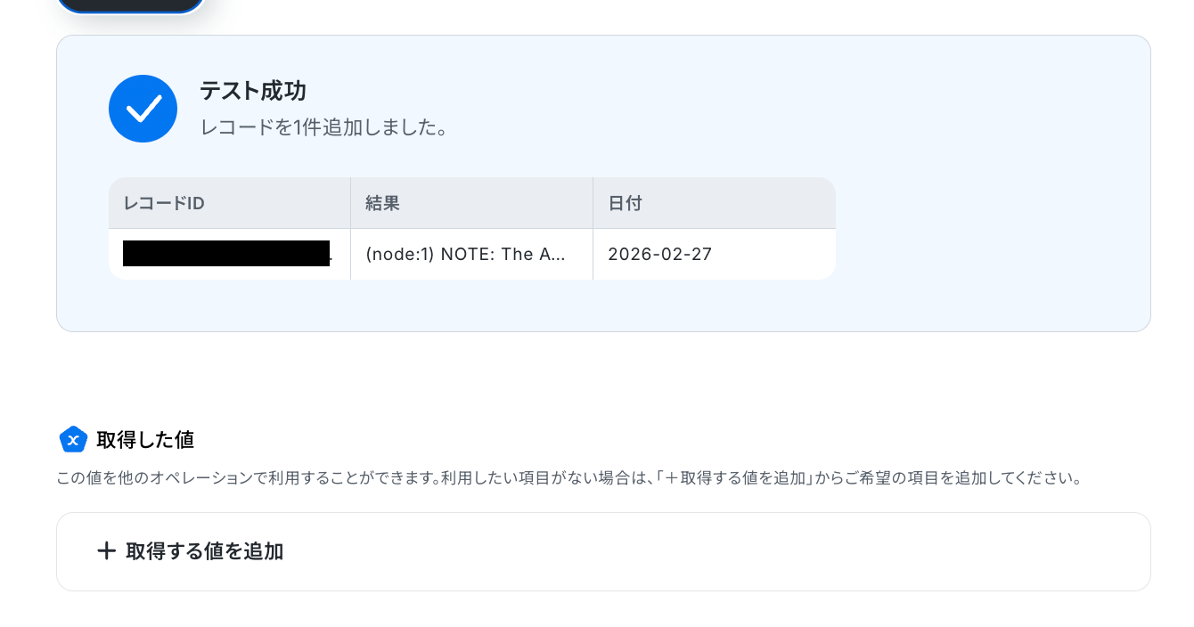 テストが成功して取得した値が確認できたら、「完了」ボタンを押しておきます。