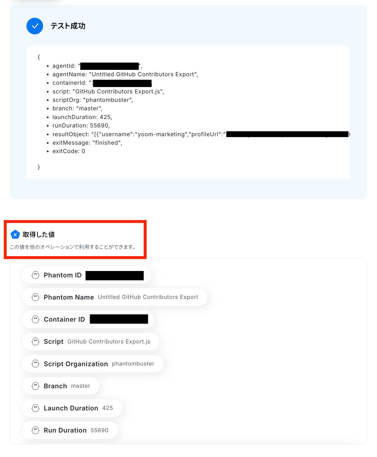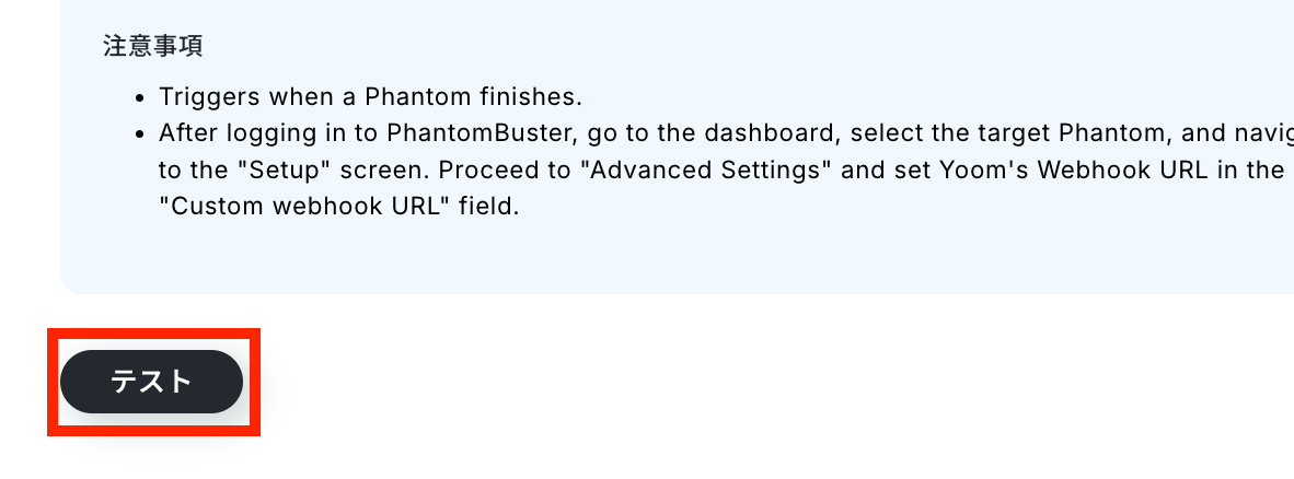 トリガーとなるPhantomを実行してから、Yoomの設定に戻り「テスト」をクリックします。