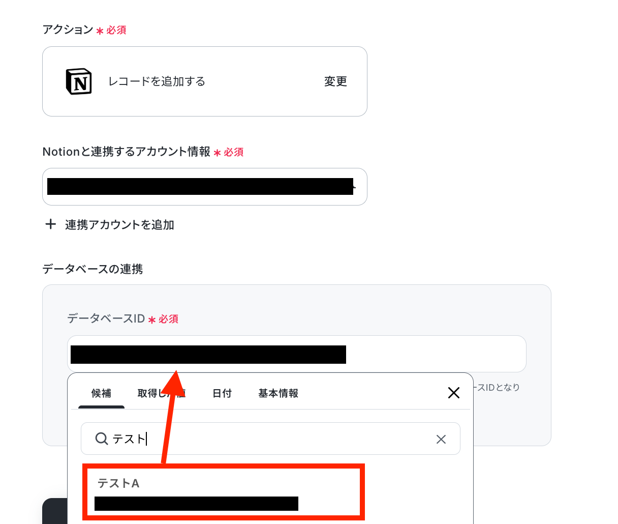 - Notionでレコードを追加するアクションを設定する際に、データを追加したいデータベースIDを任意で設定してください