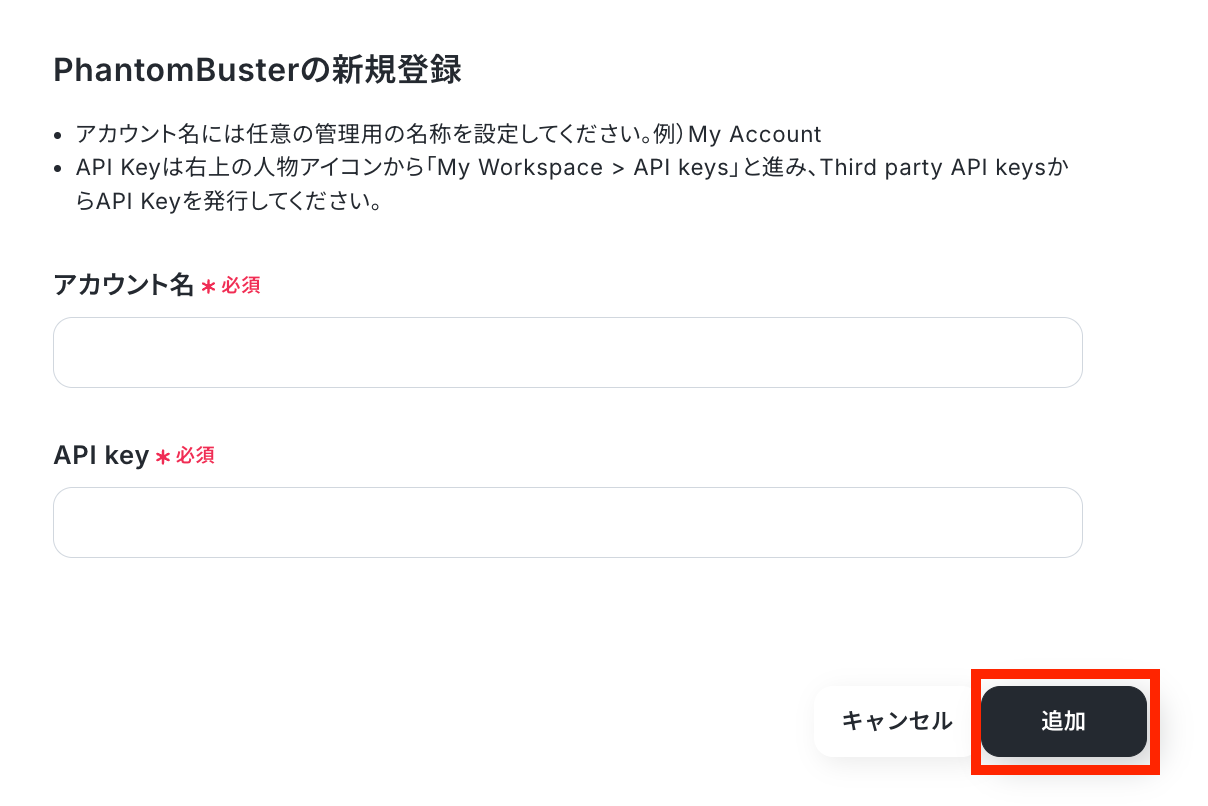 アカウント名とAPI keyを入力して、「追加」ボタンを押します。