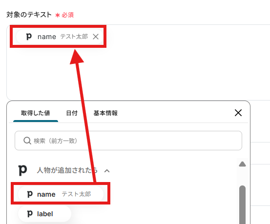対象のテキストに前ステップで取得した値から「name」を入力します。
