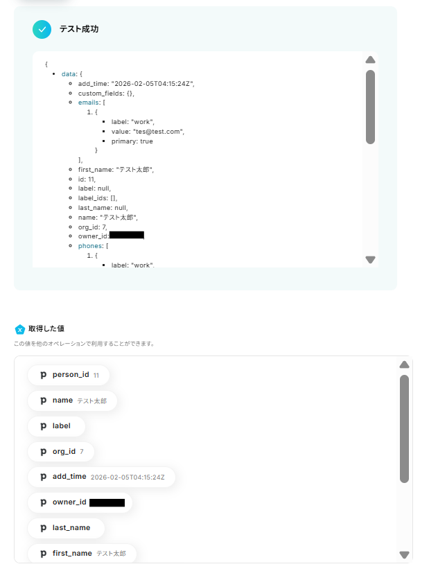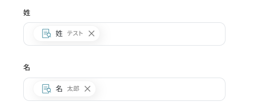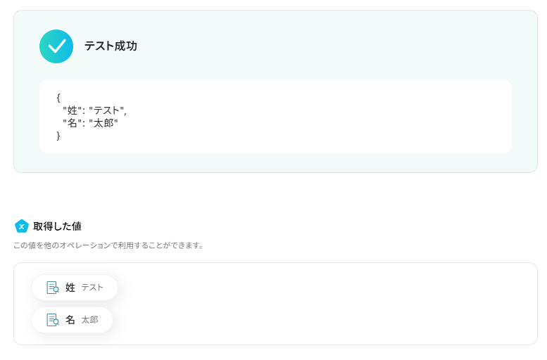 ここまで設定したらテストボタンをクリックしてください。テストが成功すると姓名が分けて抽出され、取得した値が入ります。