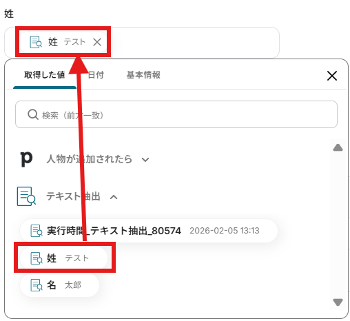 「姓」「名」にはテキスト抽出を行った際の取得した値から、姓と名をそれぞれ入力してください。
