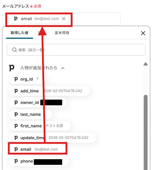 「メールアドレス」にはトリガーで取得した値から「email」を入力しましょう。