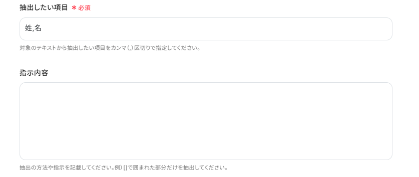 抽出したい項目はデフォルト設定通り「姓,名」としています。今回は簡単な抽出なので、指示内容は特に記載していません。