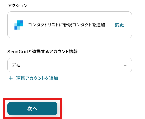 アクションはデフォルト設定のまま、アカウント情報は、連携したいアカウントが選択されているか確認してください。確認出来たら「次へ」をクリックしましょう。