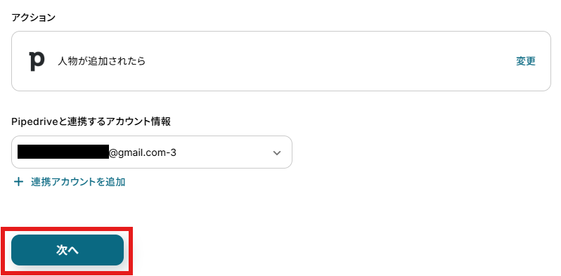 アクションはデフォルト設定のまま、アカウント情報は、連携したいアカウントが選択されているか確認してください。確認が終わったら「次へ」で進みましょう。