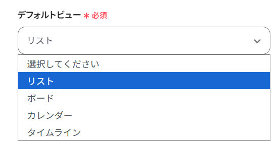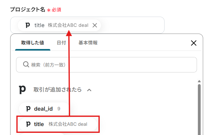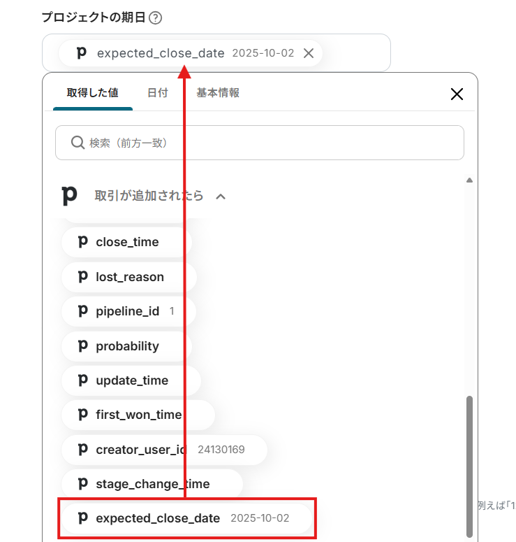 「プロジェクトの期日」は、入力欄をクリックして表示される取得した値から選択してください。
