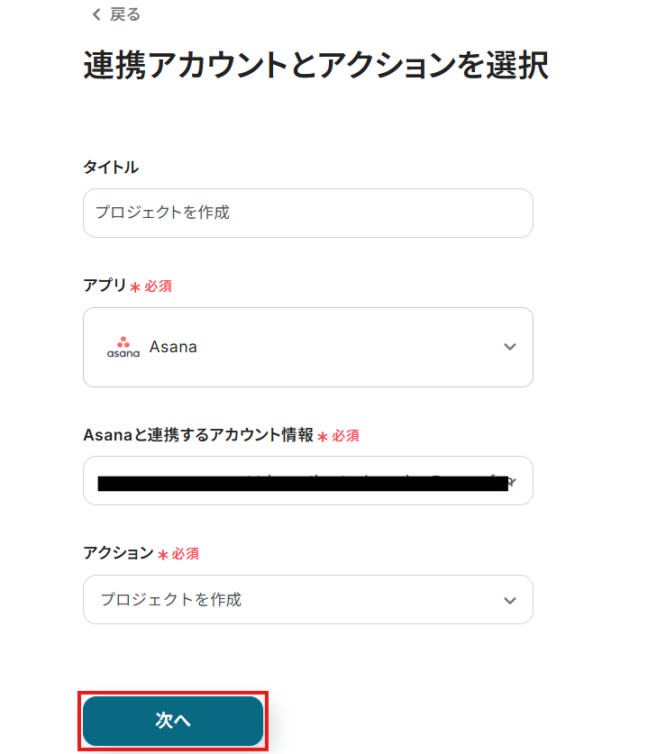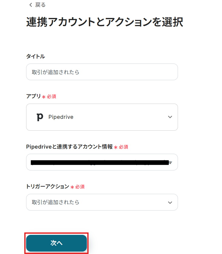 連携するアカウント情報には、ステップ1で連携したアカウント情報が反映されています。トリガーアクションはそのままにして、「次へ」をクリックしてください。