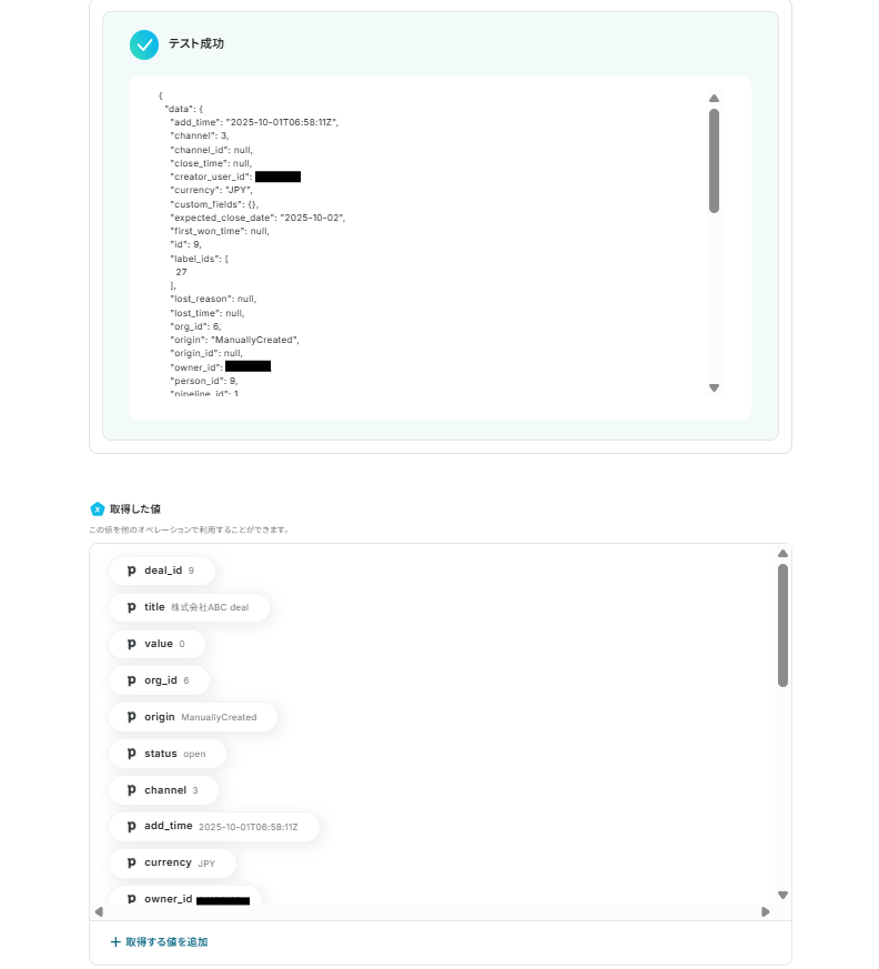 トリガーやオペレーション設定時に、「テスト」を実行して取得した値です。