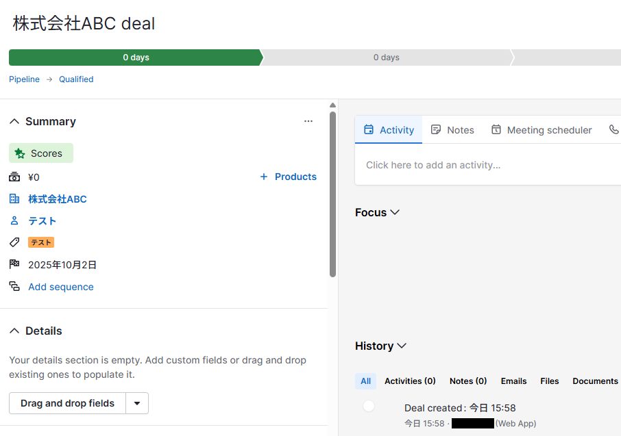 4.次はPipedriveで、登録したWebhookが正常にトリガーアクションを検知できるかのテストを行います。