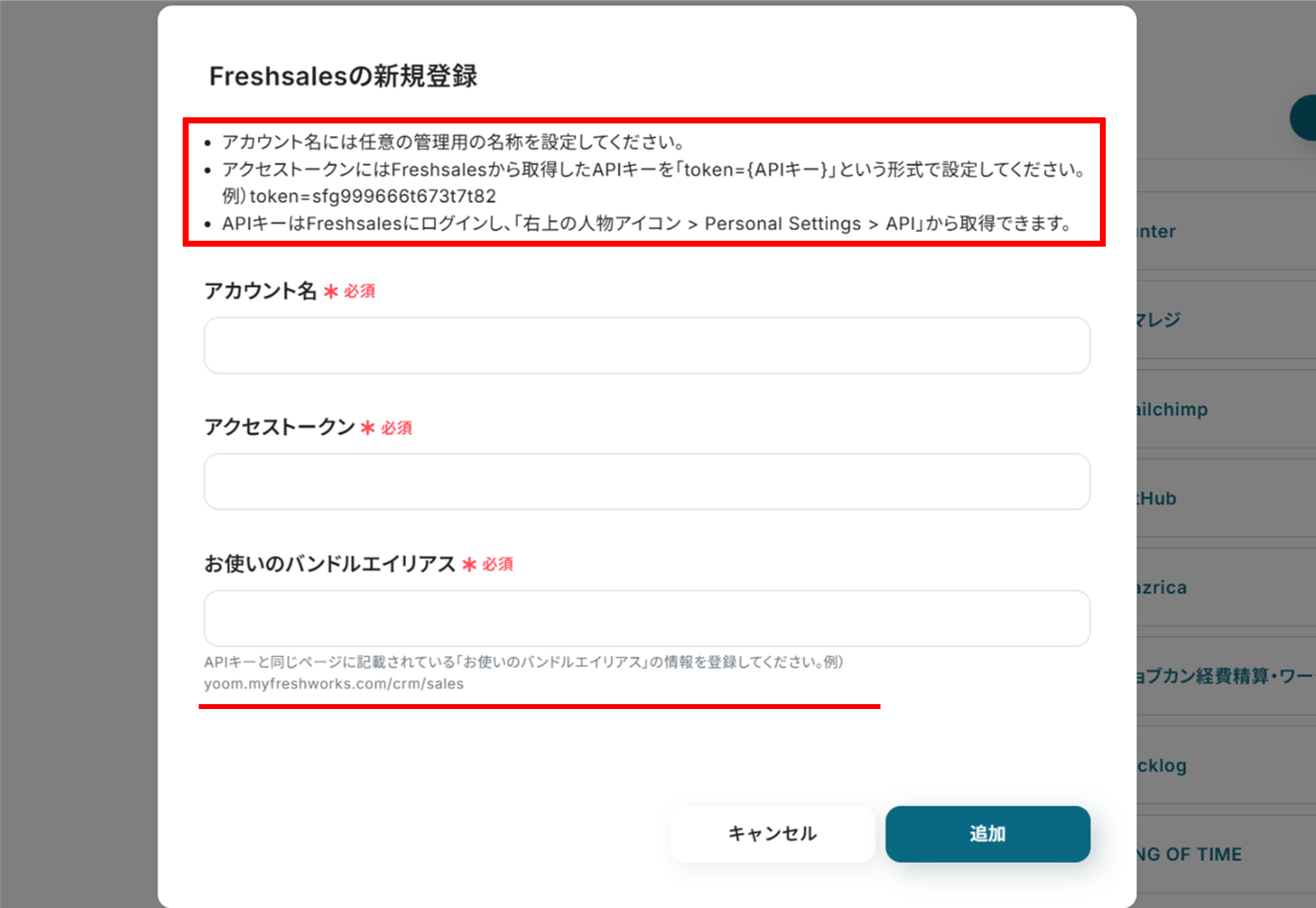 「Freshsalesの新規登録」画面から赤枠と赤線を確認の上、アカウント名、アクセストークン、お使いのバンドルエイリアスを入力し「追加」をクリックします。