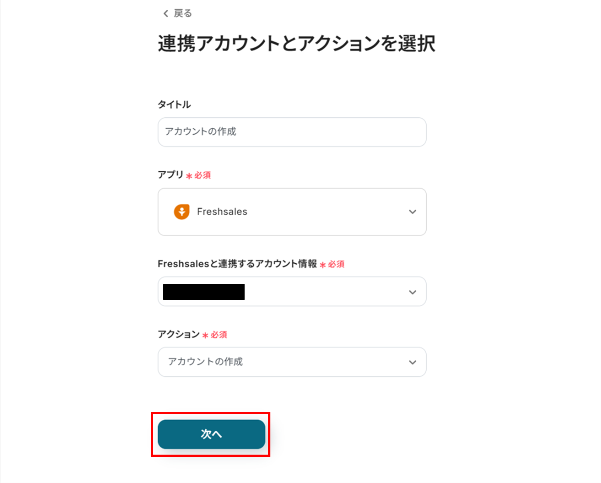 (2)「連携アカウントとアクションを選択」画面から、Freshsalesと連携するアカウント情報に誤りがないかを確認し、アクションは「アカウントの作成」のままで「次へ」をクリックします。