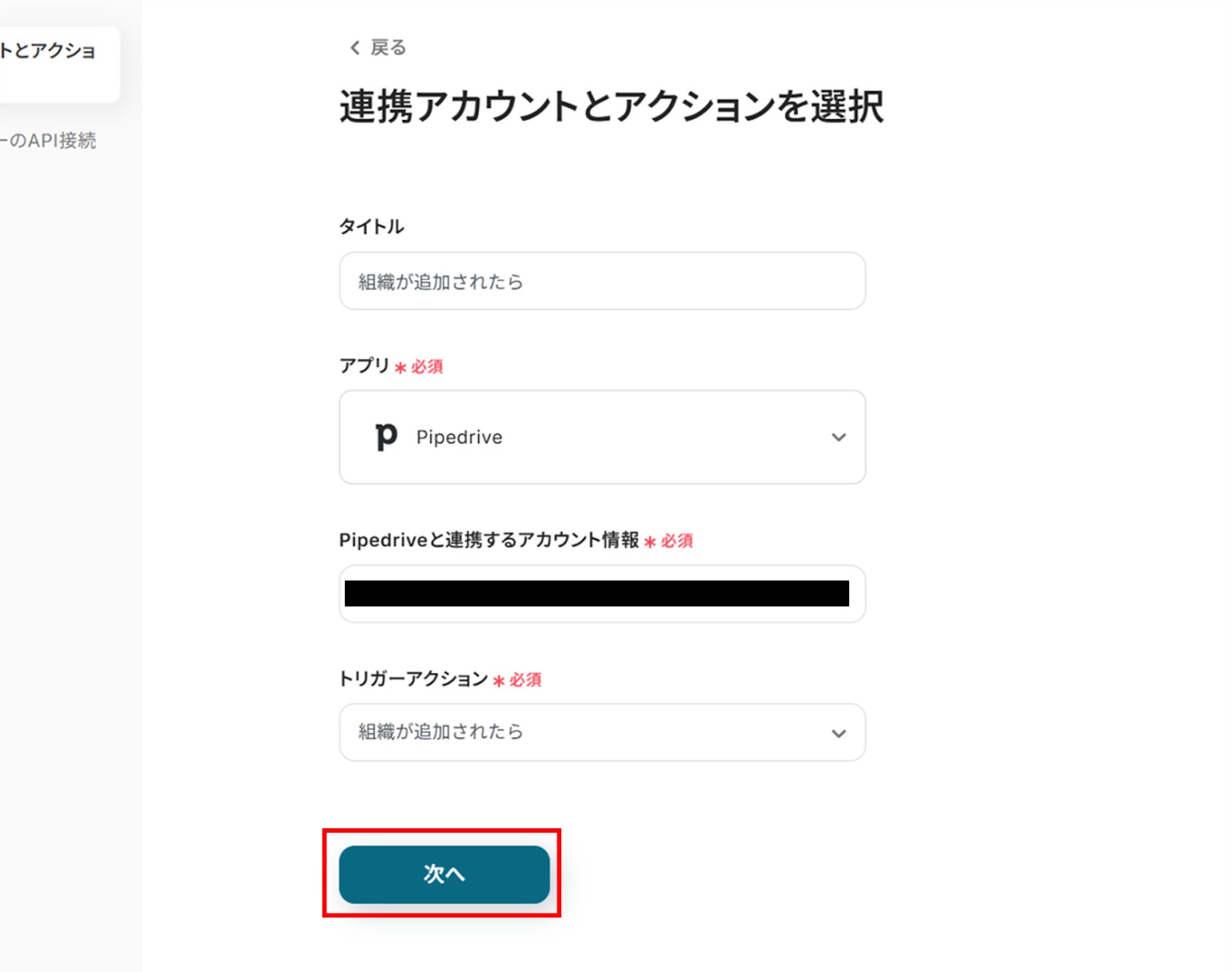 Pipedriveと連携するアカウント情報に誤りがないかを確認し、トリガーアクションは「組織が追加されたら」のままで「次へ」をクリックします。