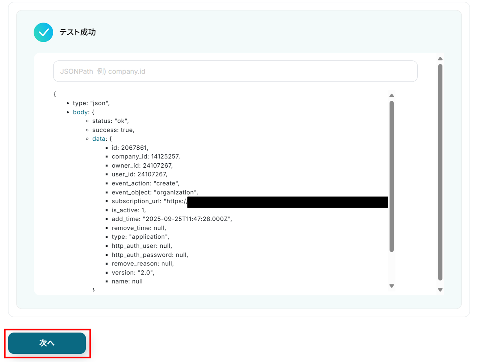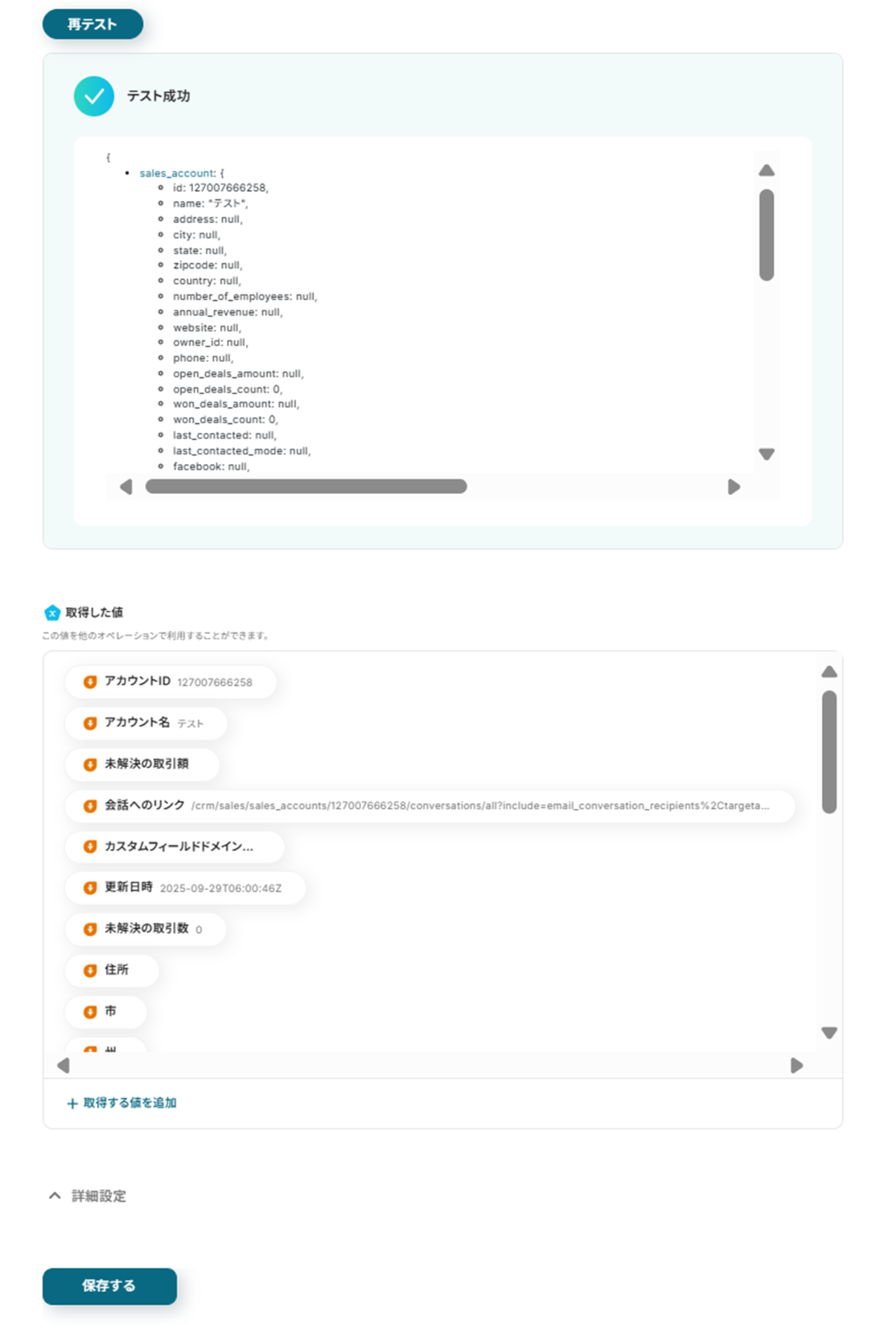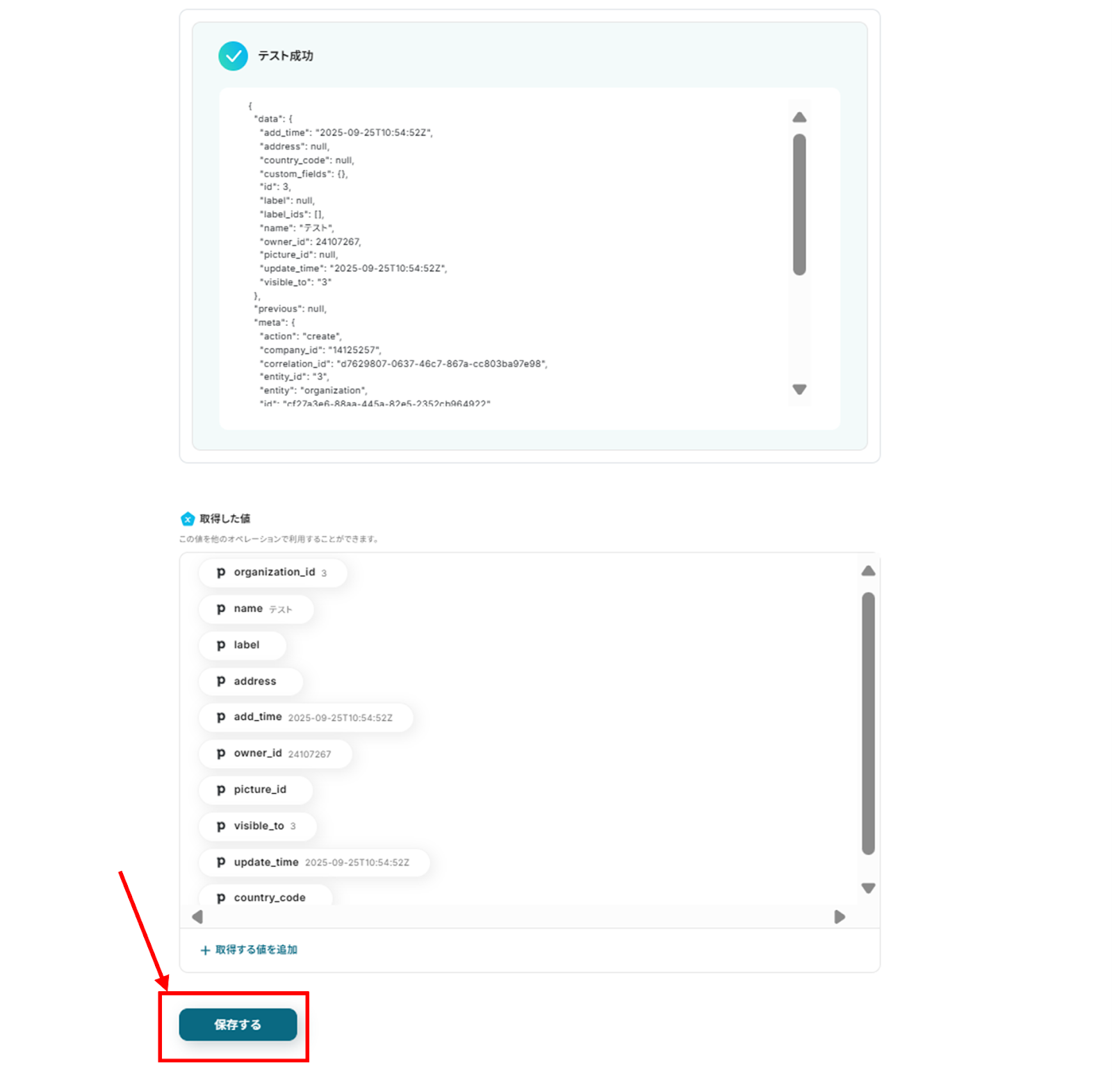 先ほどと同じようにテスト成功画面が現れます。「取得した値」にPipedriveの情報が反映されればテスト成功です。