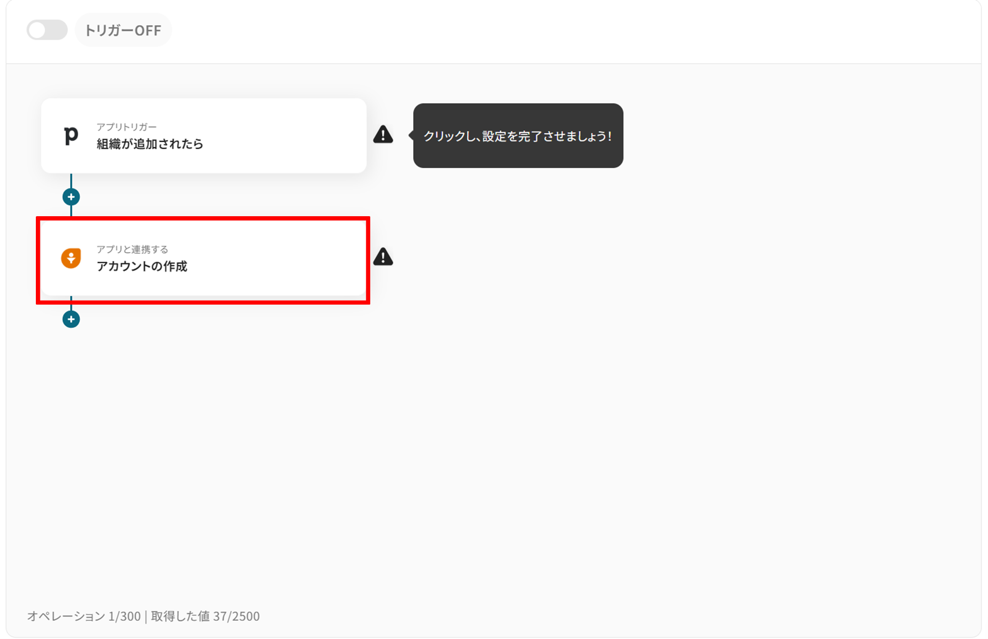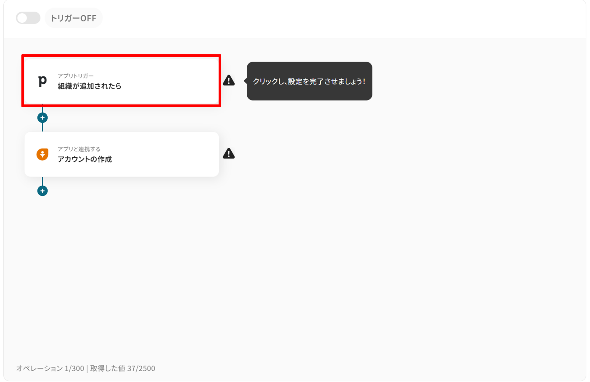 アプリトリガーの「組織が追加されたら」をクリックします。