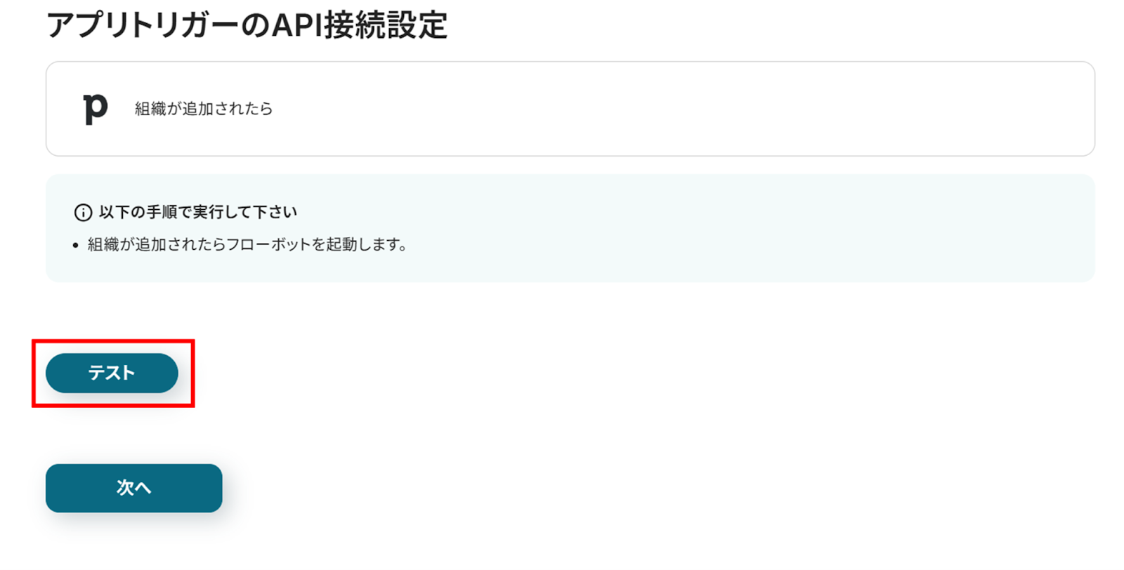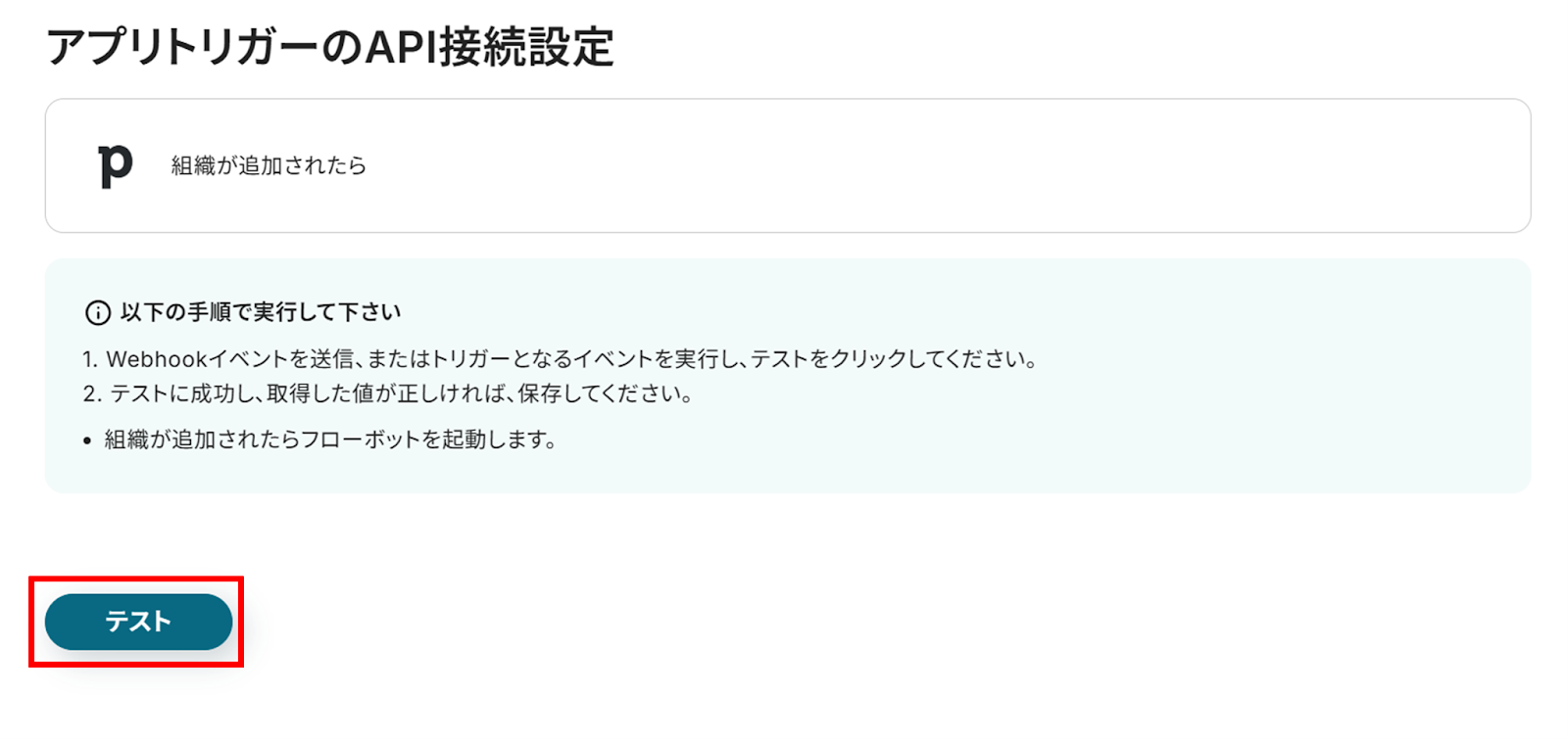 (4)「アプリトリガーのAPI接続設定」画面から「テスト」をクリックします。まずは、YoomとPipedriveのWebhook接続を確認します。