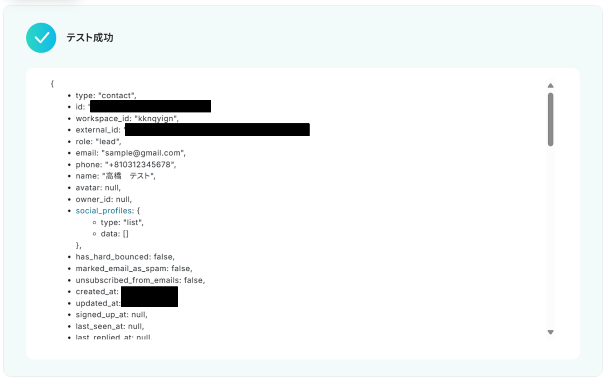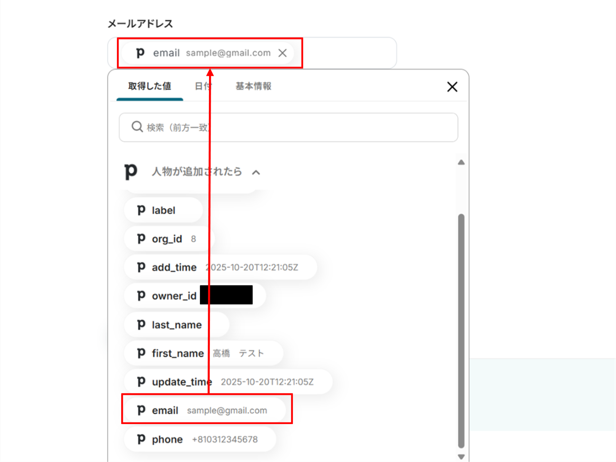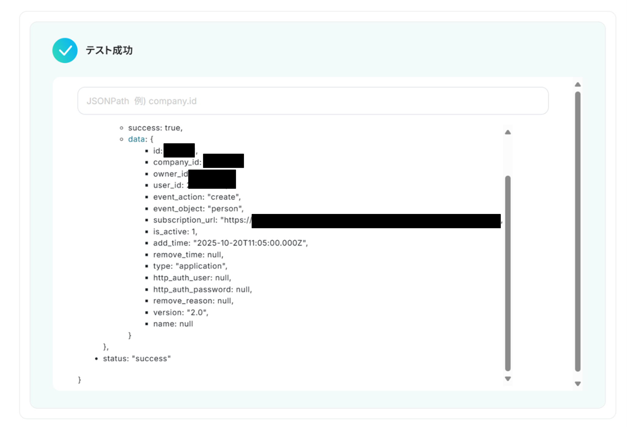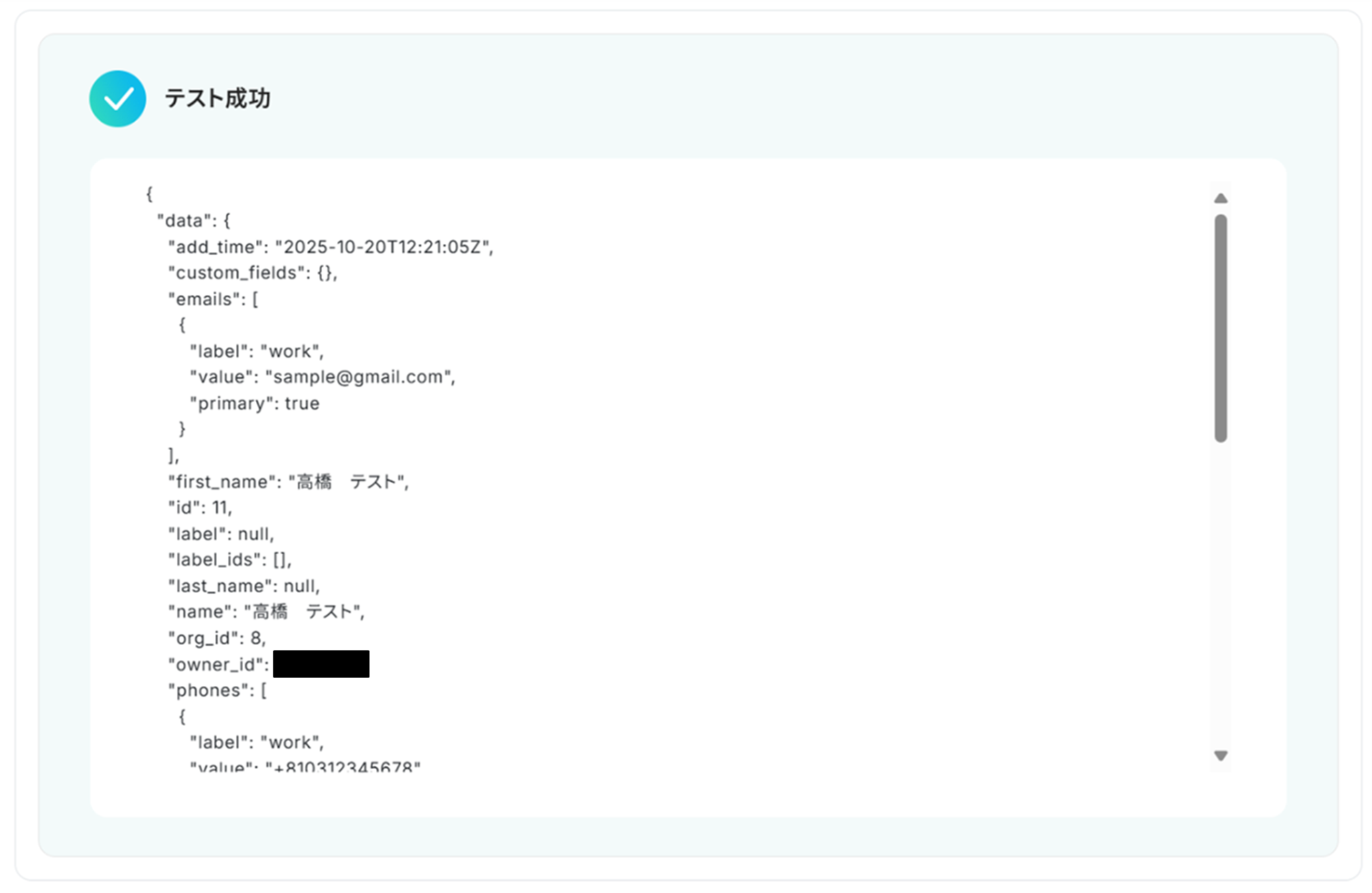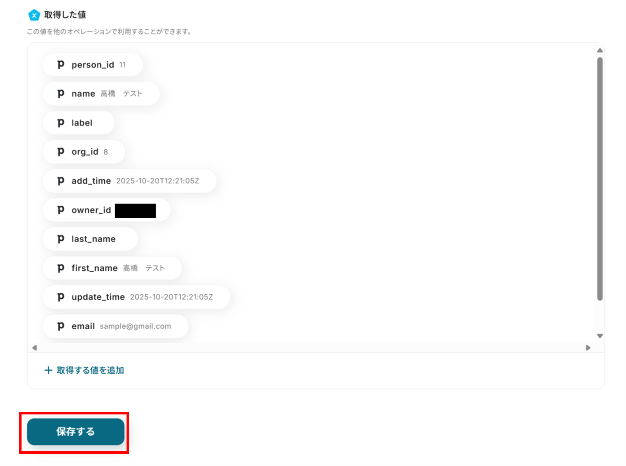 「取得した値」にPipedriveの情報が反映されればテスト成功です。