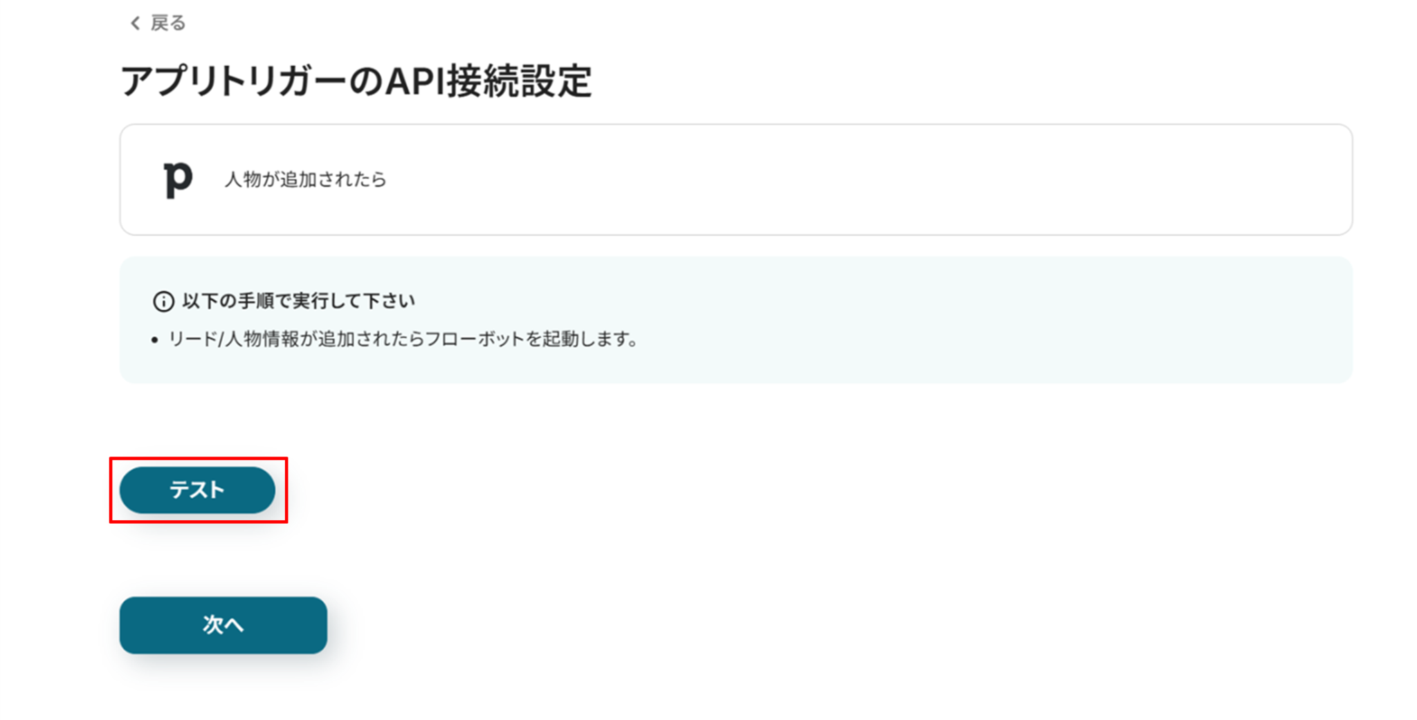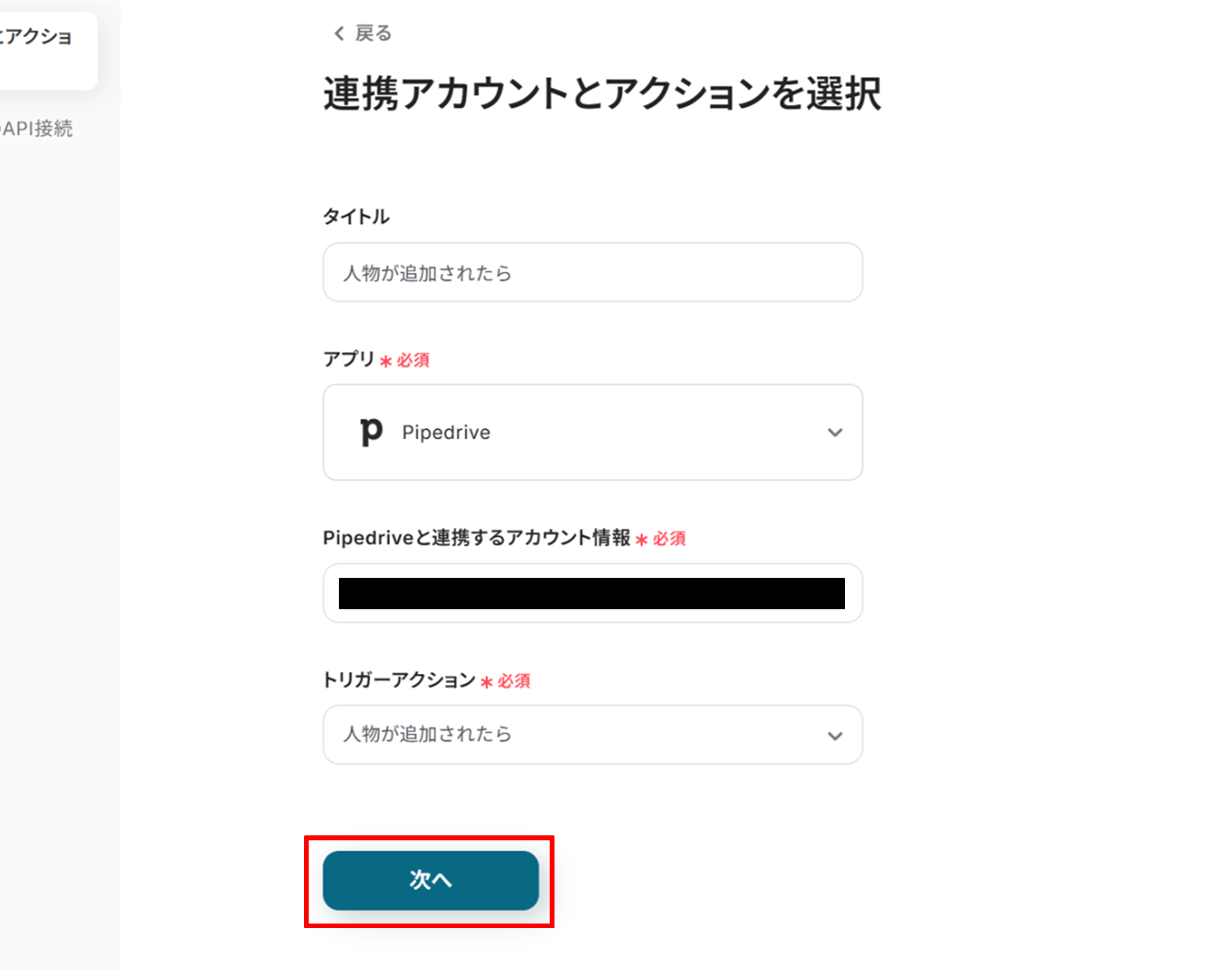 Pipedriveと連携するアカウント情報に誤りがないかを確認し、トリガーアクションは「人物が追加されたら」のままで「次へ」をクリックします。