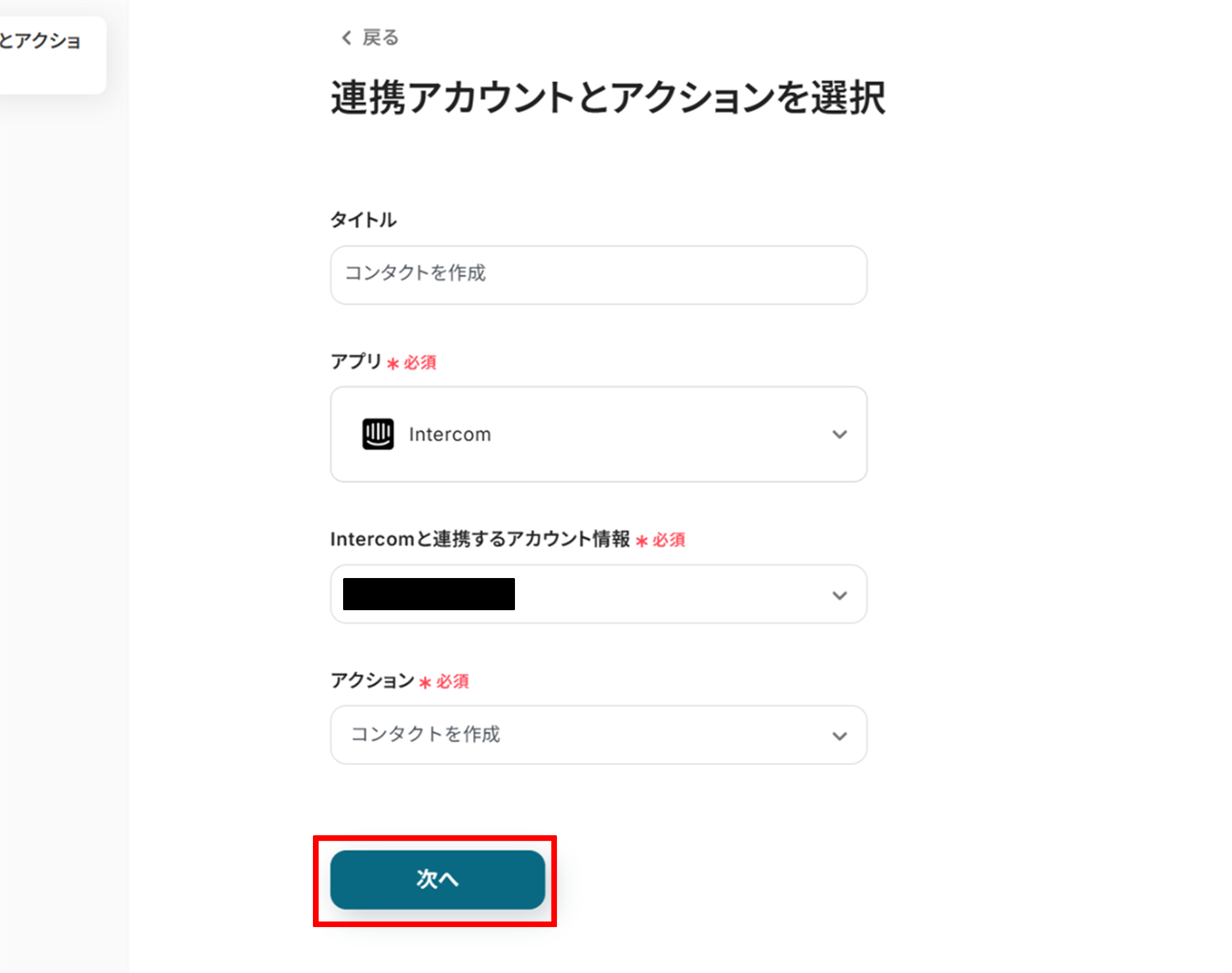 (2)「連携アカウントとアクションを選択」画面から、Intercomと連携するアカウント情報に誤りがないかを確認し、アクションは「コンタクトを作成」のままで「次へ」をクリックします。