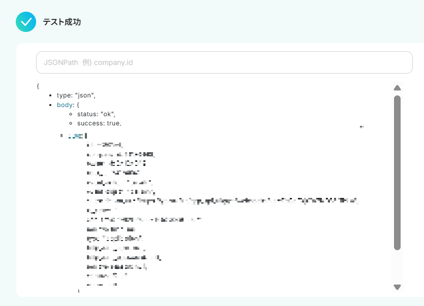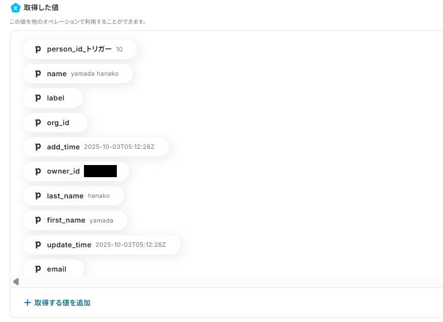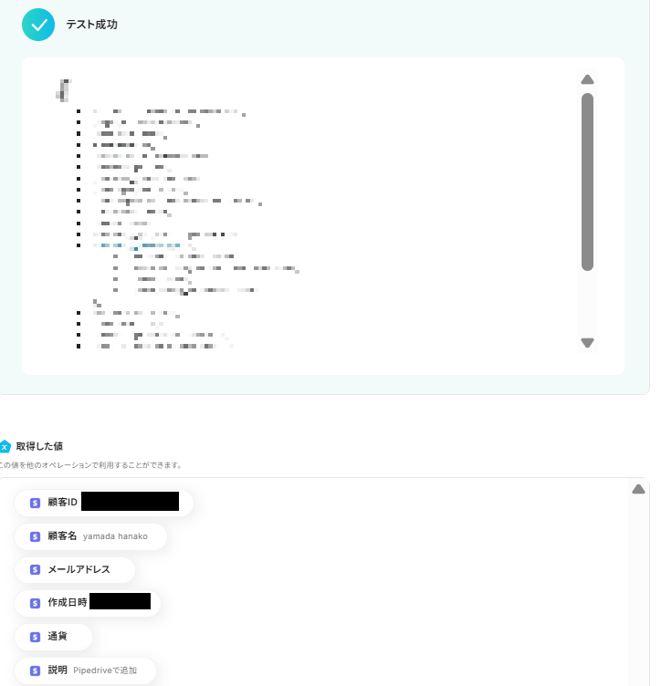 テストが成功し、取得した値にPipedriveの情報が反映していれば成功です。