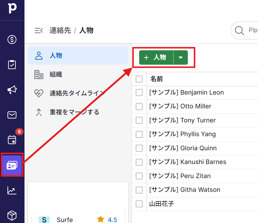 テスト用に人物の追加を行います。Pipedriveで画面左のバーの「連絡先」より入り、人物の追加を行ってください。