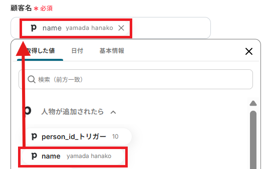 もし入っていない場合や変更したい場合は、下記画像のように「取得した値」から対象の項目を選んで入力してください。