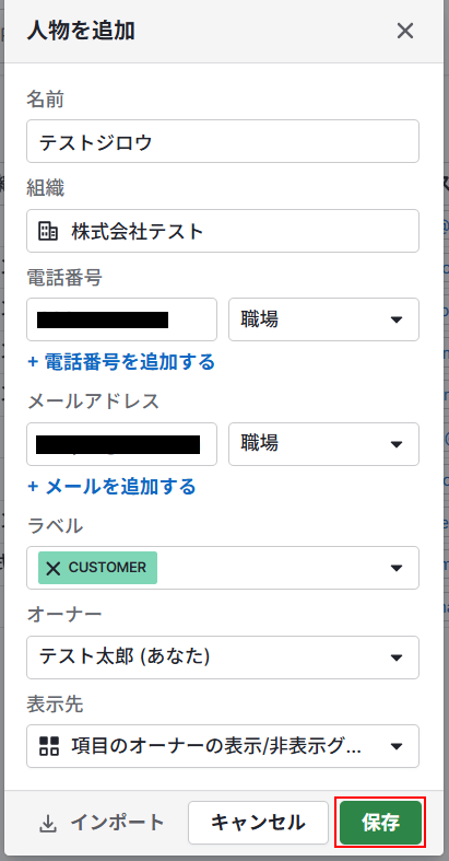 Pipedriveの画面に移動し、テスト用の人物を追加しましょう。