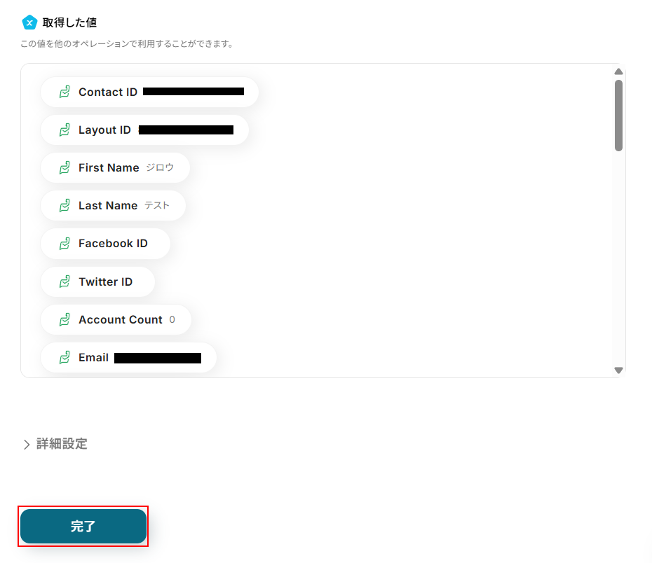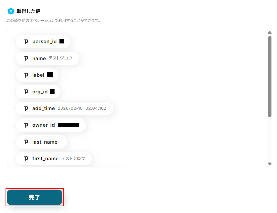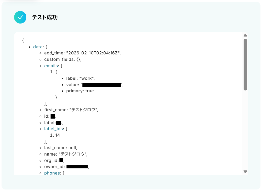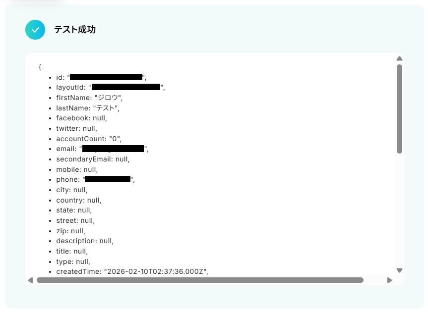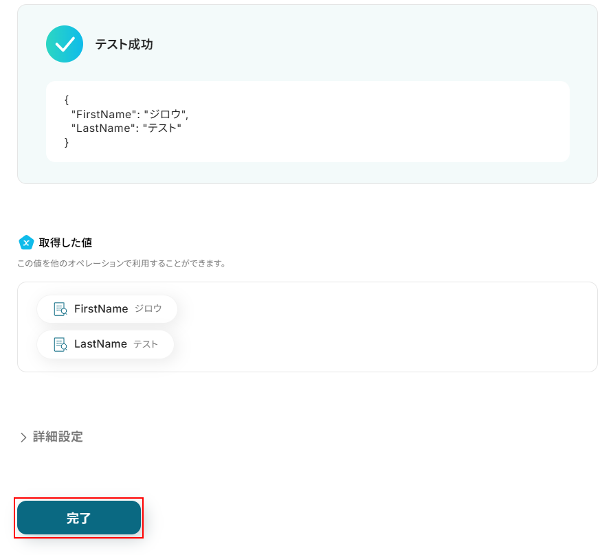 テストに成功するとテスト成功画面と取得した値が表示されますので、抽出したい項目が表示されているかご確認ください。
