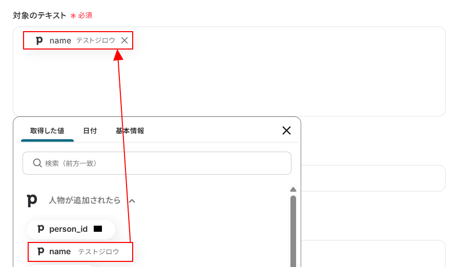 - 次に、オペレーションでPipedriveの「人物情報を検索」アクションを設定し、取引に紐付ける人物情報を特定します