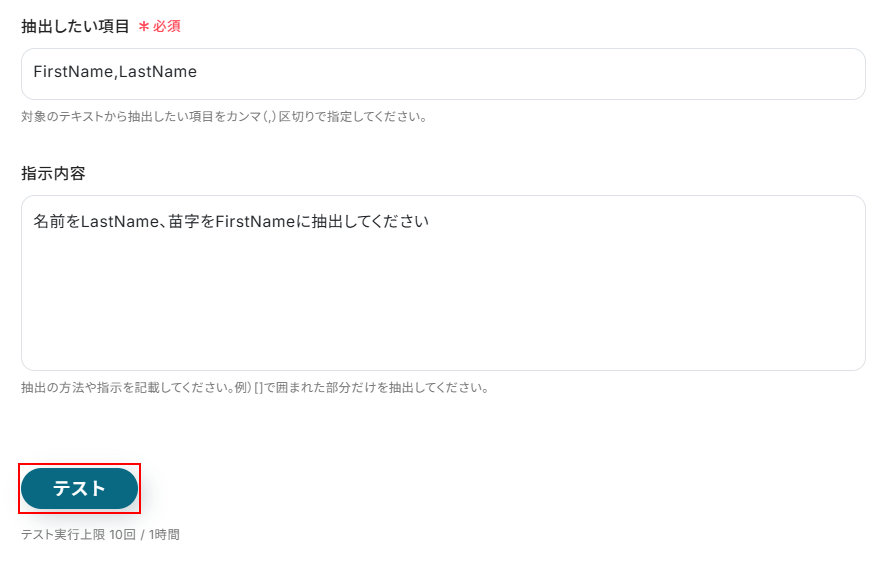 - 続いて、オペレーションで「テキスト抽出」を設定し、トリガーで取得した氏名から姓と名を抽出します