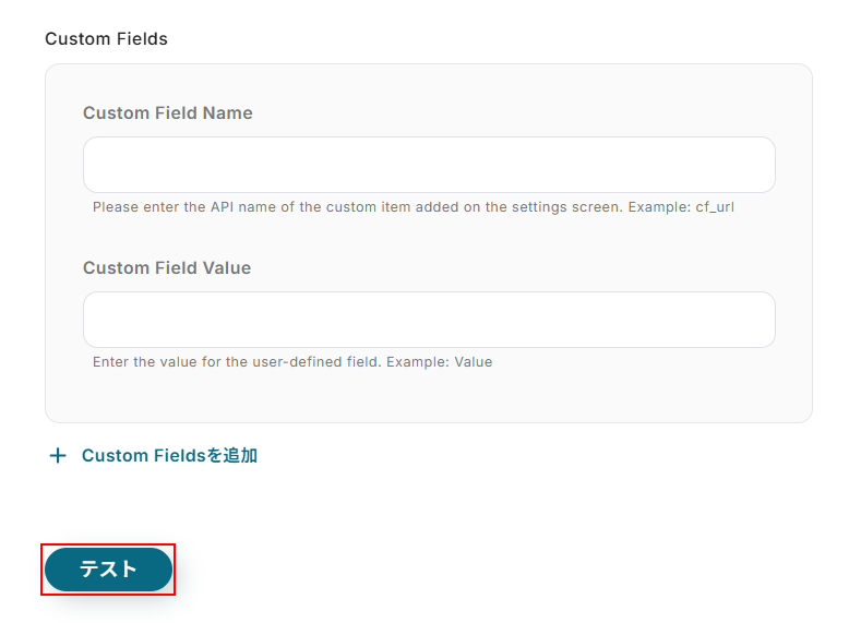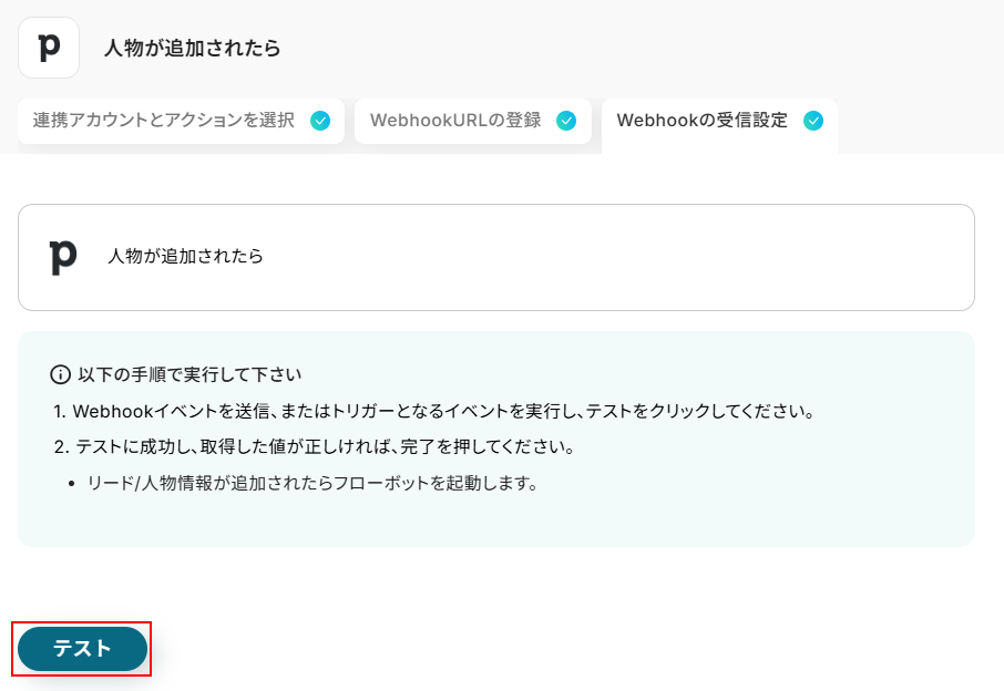 追加できたらYoomの画面に戻り、テストをクリックしましょう。