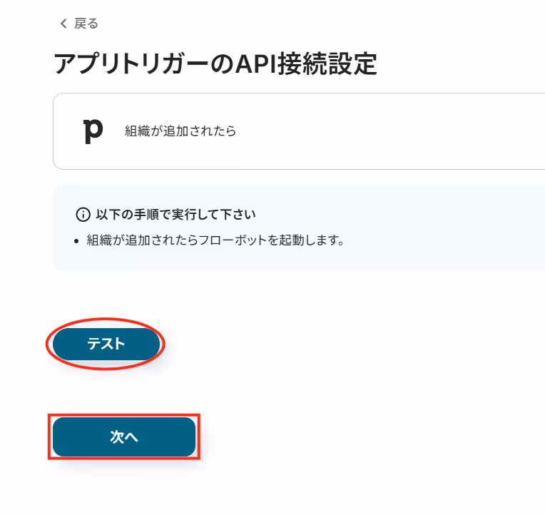 先ほどの画面で「OK」をクリックして、表示された画面のアプリトリガー「組織が追加されたら」をクリックしましょう。