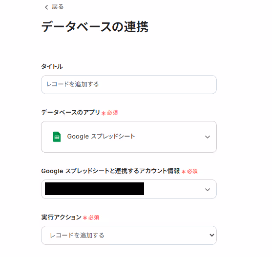 「Google スプレッドシートと連携するアカウント情報」を確認し、「実行アクション」はそのままで、データベースの連携の各項目を設定していきます。