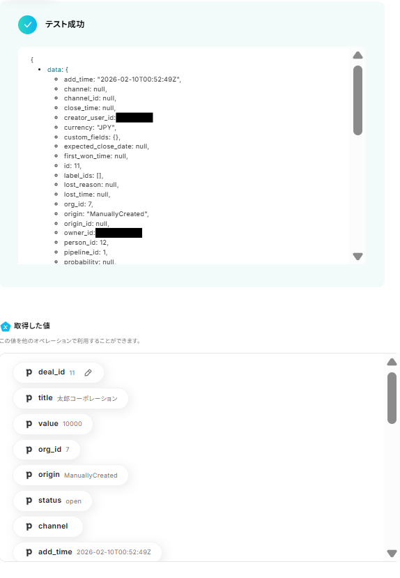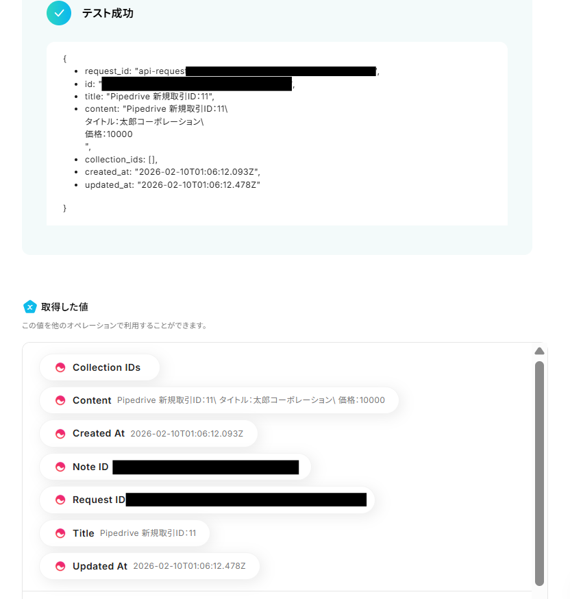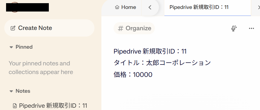 - Memの「Create Note」アクションでは、NoteにPipedriveから取得した情報を自由に設定できます。例えば、取引名や担当者ID、金額など、必要な取引データを盛り込むといったカスタマイズが可能です。