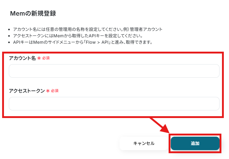 アカウント名は任意の値を入力し、アクセストークンにはMemで取得したAPIキーを入力しましょう。