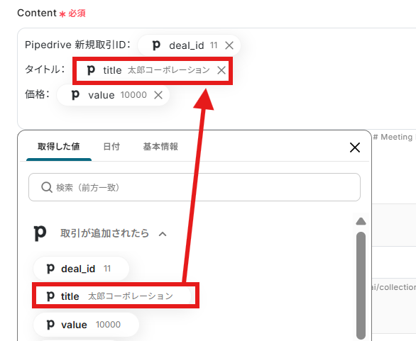 - Pipedriveで取引を追加する際、取引のタイトルや金額、担当者といった各項目には、固定値だけでなく、前段のAirtableから取得した値を埋め込んで動的に設定できます。