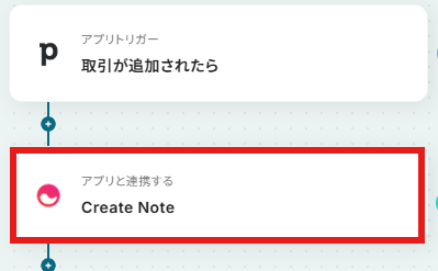 - 最後に、オペレーションでMemの「Create Note」アクションを設定し、トリガーで取得した取引情報を連携するよう設定します。