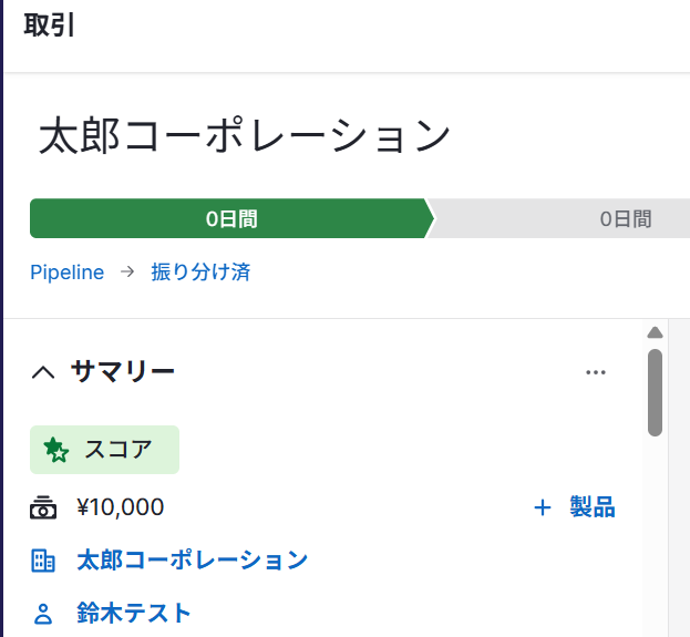 今回のWebhookイベントが「取引の追加」なので、Pipedriveのページに移動し、取引を追加します。