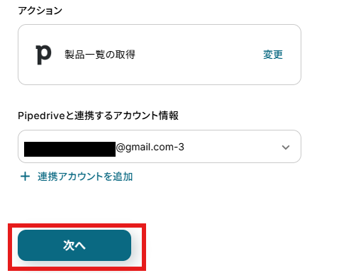 - 次に、オペレーションでPipedriveを選択し、「製品一覧の取得」アクションを設定します。