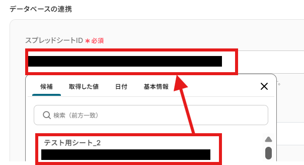 「データベースの連携」箇所で、上記のGoogle スプレッドシートを候補から選択していきます。