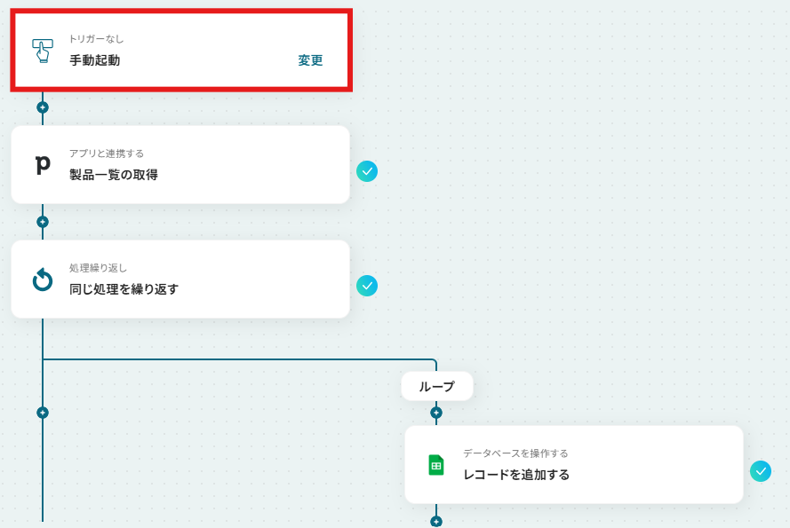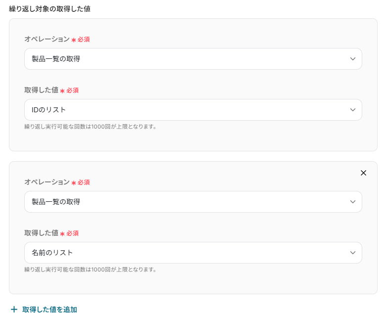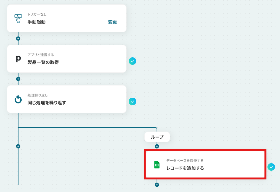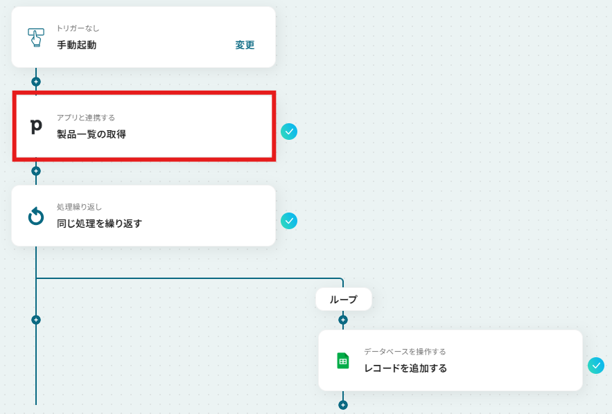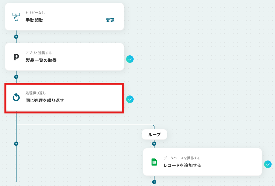 - 次に、取得した製品リストのデータ1件ずつに処理を行うため、繰り返し(ループ)処理を設定します。