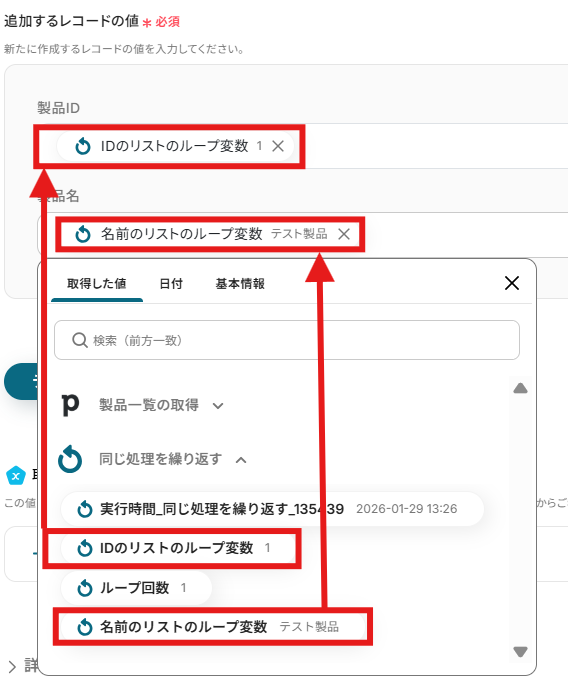 追加するレコードの値は、それぞれ以下のように「同じ処理を繰り返す」のループ変数を入力してください。