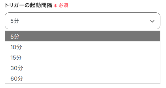 - トリガーは5分、10分、15分、30分、60分の間隔で起動間隔を選択できます。